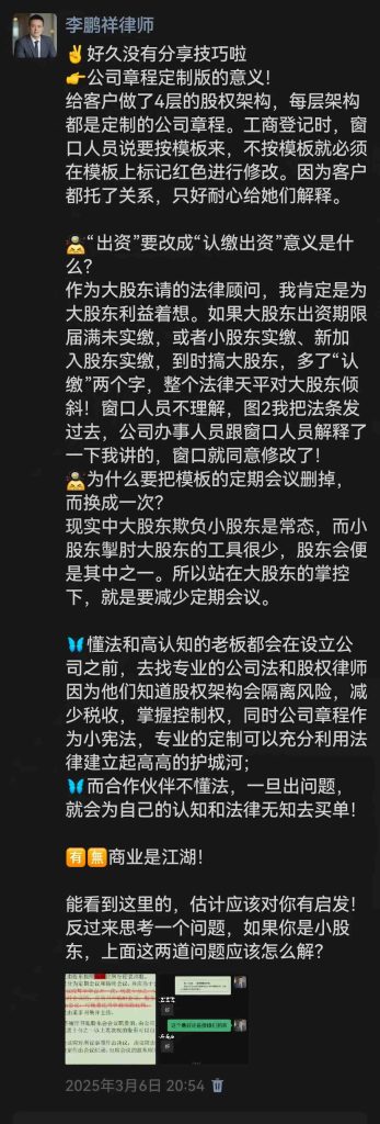 所以,小股东有机会参与制定章程,可千万别错过“个性化定制”,实现权责利的精细匹配。