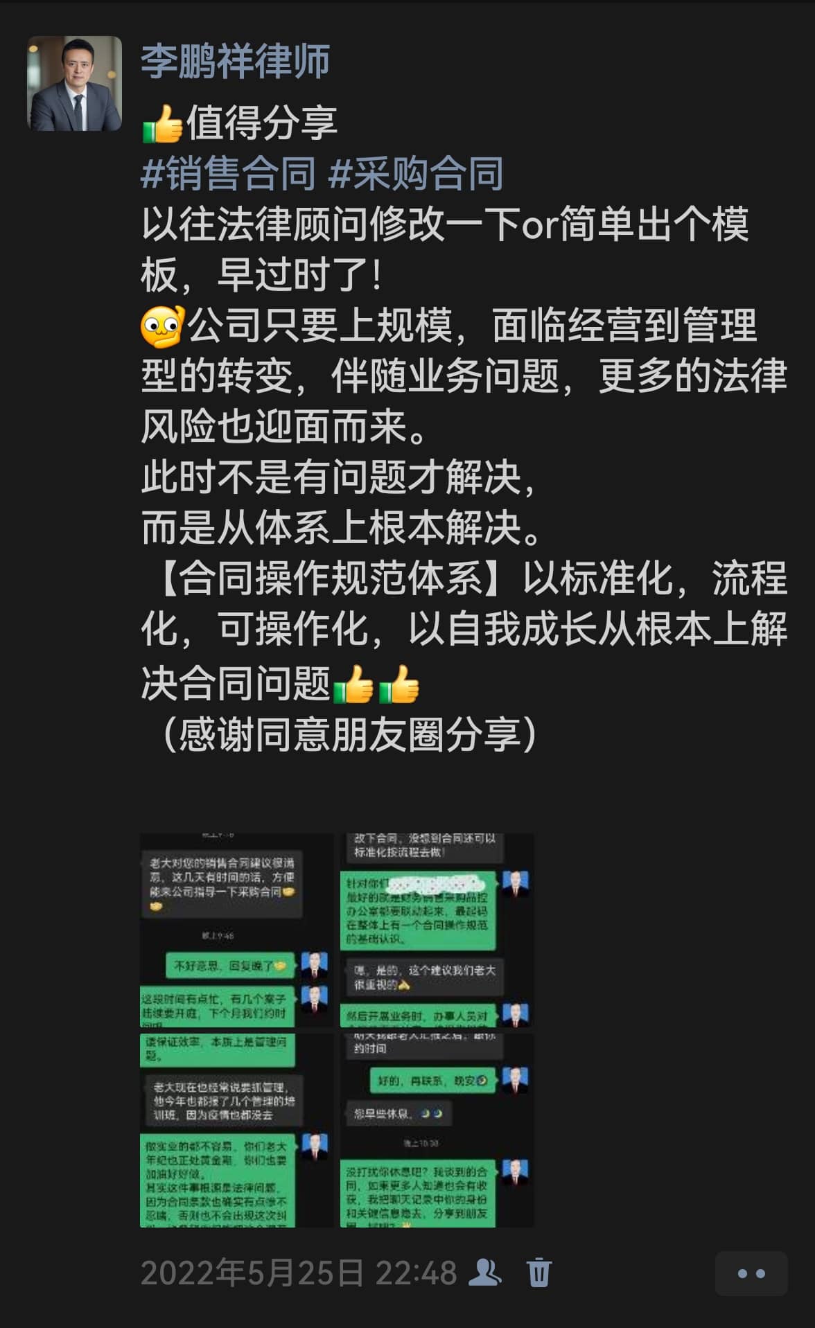 Ps.如果建立一套机制,鹏祥律师有定制的“销售合同”和“采购合同”服务。特点是多部门多岗位联动、拆掉部门的墙、防止踢皮球和最大程度杜绝舞弊行为。
