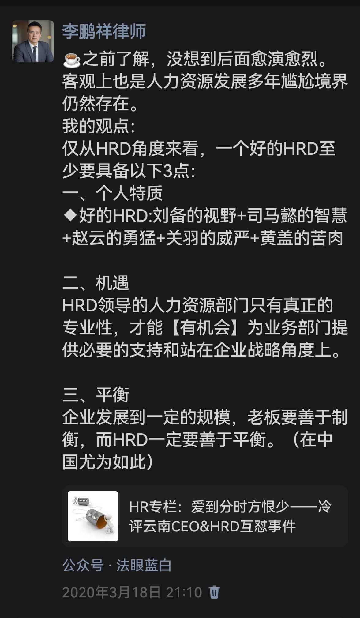 鹏祥律师转型做律师前,年轻的时候也热血过,被老板器重负责做公司变革,当时自己刚上任,副总就被迫离职了;然后为公司批量引进新鲜血液,使得市场部直接成为敌对势力。去年恰好联系上了之前我引进的市场部专业线经理,一番我不知道的故事更叫人感叹。