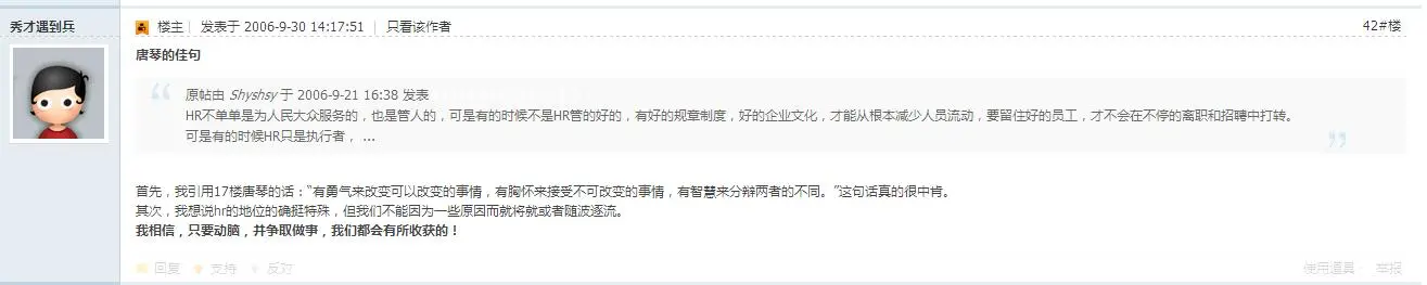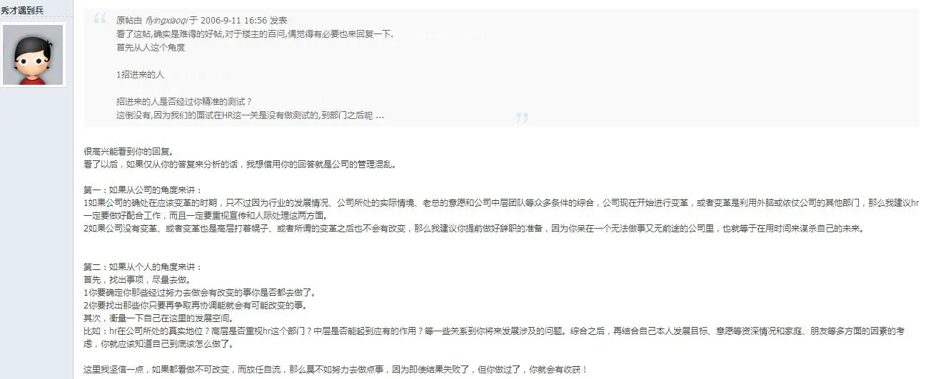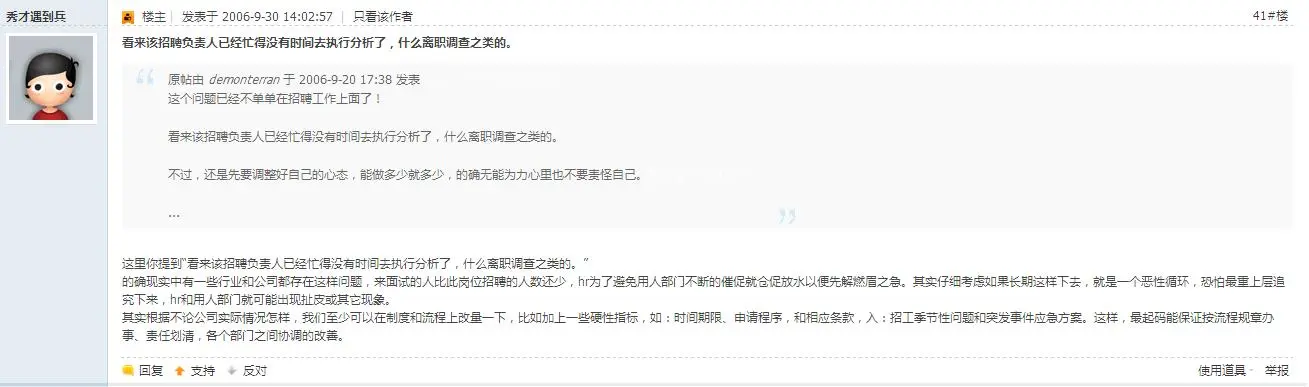 这里是他的原文:这几天心情很不好,睡觉也老是做梦在招人。现在感觉招人的速度远远比不上员工走的速度。两三个星期之内走了十几个品检,两个星期只有一个面试品检的合格。然后又还有其他什么技术员啊,工程师啊,这个部门说,快快给我招人,那个部门说,人呢,我要的人呢,简直要疯掉。最夸张的是今天,一下从经理那收到十张用人需求表。我先晕后倒。对这种无休止的招聘很是厌倦了,不知道大家做招聘的会不会有我这样的感受呢?