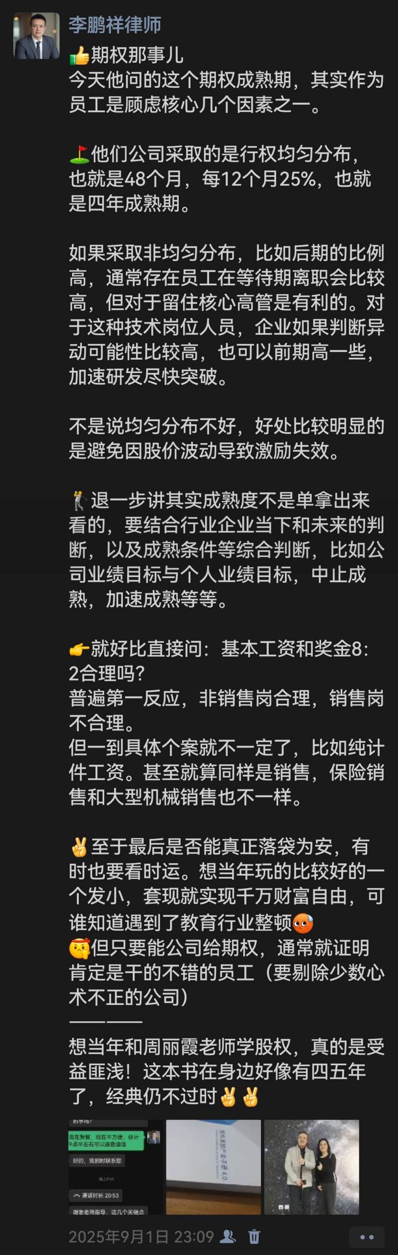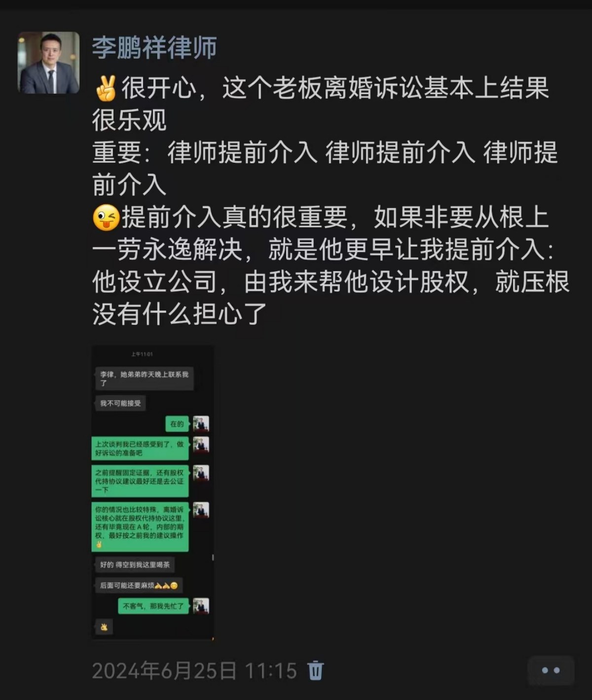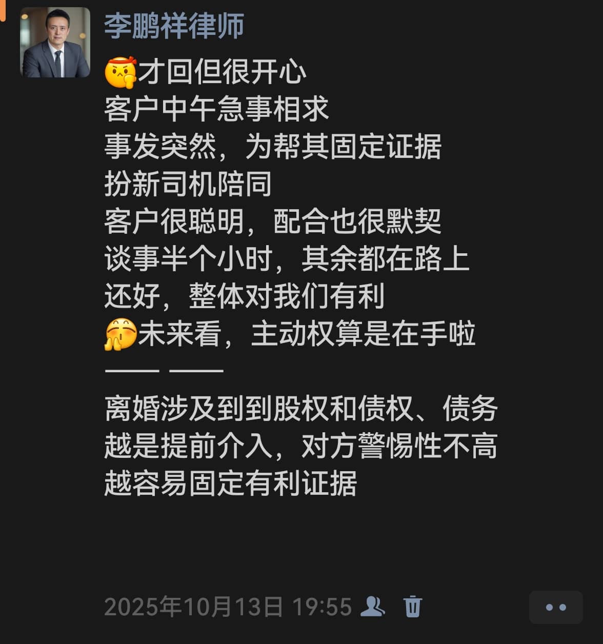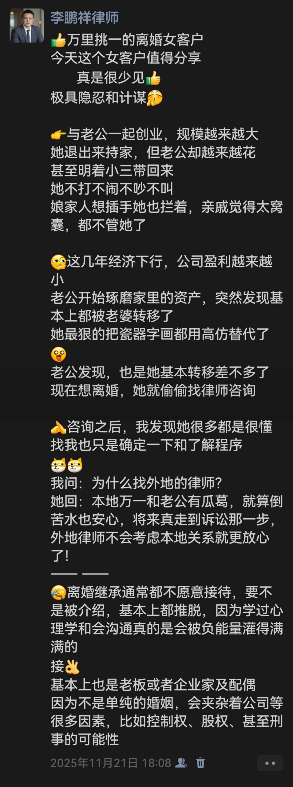 鹏祥律师这个朋友圈截图想提醒,这类谈判中,“扮演的必要性、情感的特殊性、彼此的性格及沟通、人性的最终判断”这些制衡的因素是不可忽视的。