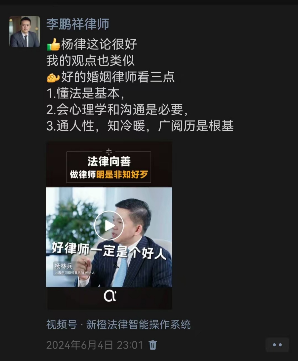 相信到这里,鹏祥律师提到的最佳的律师能力的组合是婚姻家事+公司法+公司管理+心理学+谈判专家,大家应该实实在在地感受到了!