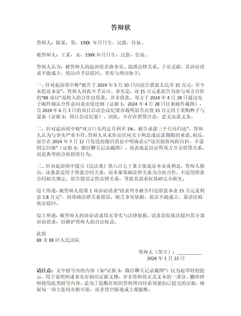 “一份优秀的答辩状,能为你赢得庭审的主动权。但请记住,它必须与你的证据清单和庭审发言形成合力。