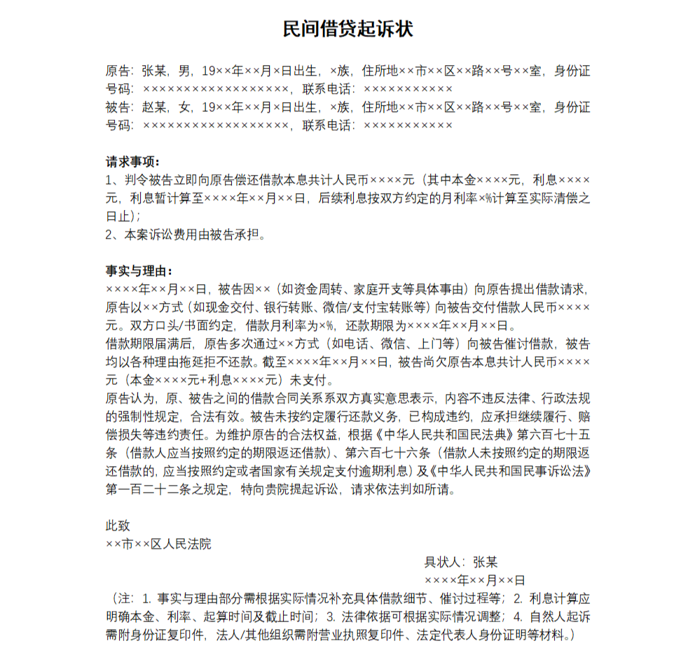 下图为民间借贷起诉状样例:
