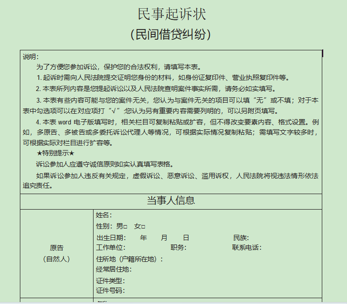 下图为要素式民间借贷起诉状部分展示: